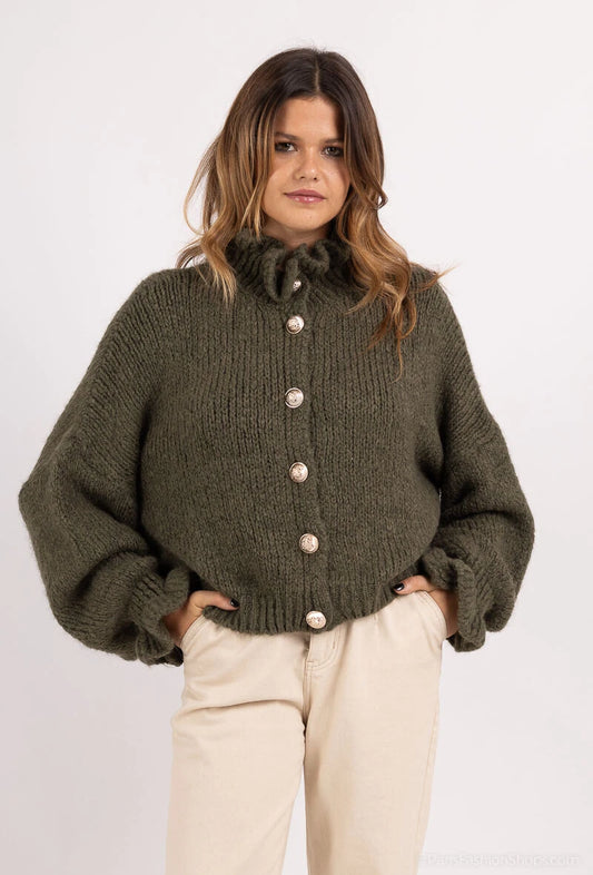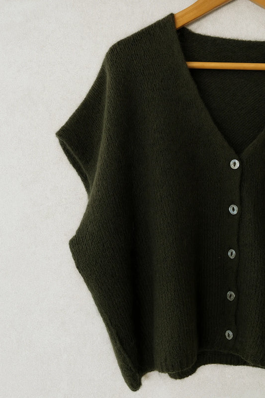 Grüne Strickjacke aus Mohair mit Puffärmeln und Perlmuttknöpfen