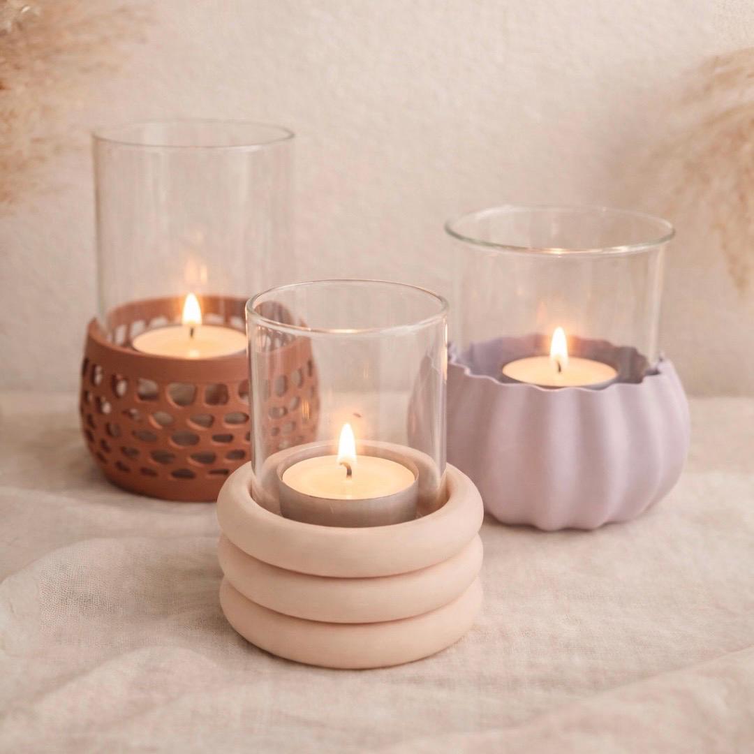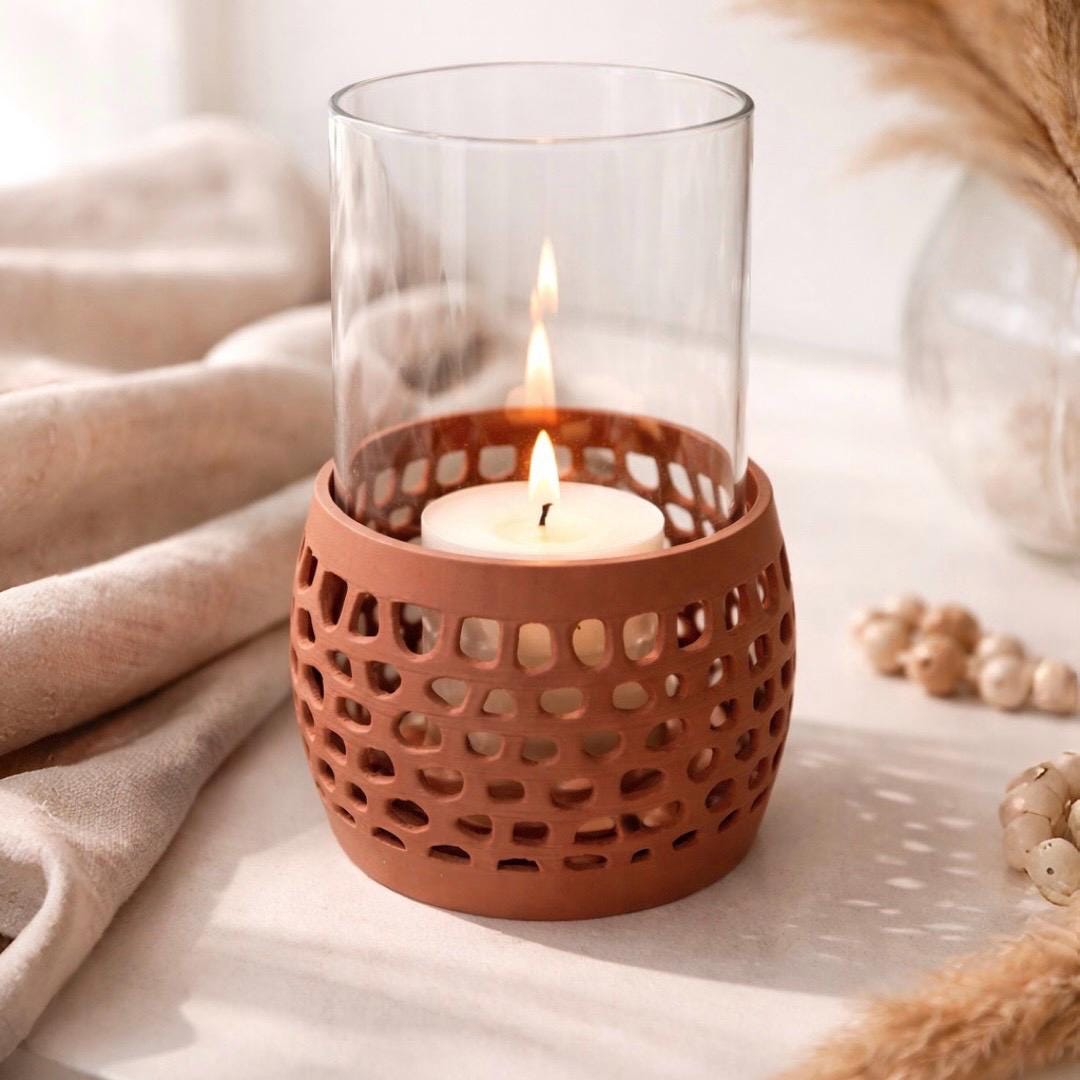 Dieser Windlichthalter wird im 3D-Druckverfahren gefertigt und zeichnet sich durch seine dekorative Lochstruktur aus, die dem Kerzenlicht zusätzliche Tiefe und ein besonders stimmungsvolles Erscheinungsbild verleiht. Die offene Struktur sorgt für eine leichte, moderne Optik und macht den Halter zu einem echten Blickfang in jeder Einrichtung.