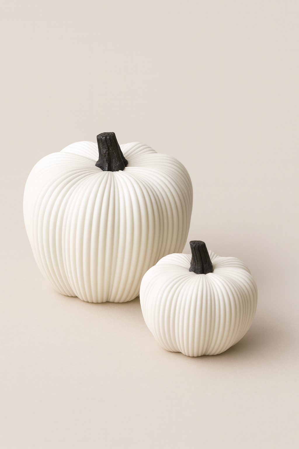 Unsere minimalistischen Deko-Kürbisse werden hochwertig im 3D-Druck aus PLA gefertigt. Das biobasierte Material sorgt für eine matte, elegante Optik; die präzisen Rillen verleihen den Kürbissen eine moderne Struktur. Ob einzeln oder im Duo – die Größen 11 cm (groß) und 8 cm (klein) setzen ruhige, skandinavische Akzente in Wohnzimmer, Küche oder Eingangsbereich. Abgebildet ist die zeitlose Kombination Knochenweiß/Schwarz. Du möchtest eine andere Farbe? Kein Problem: Antworte nach deiner Bestellung einfach per Mail mit deinem Farbwunsch – wir drucken deinen Kürbis individuell.