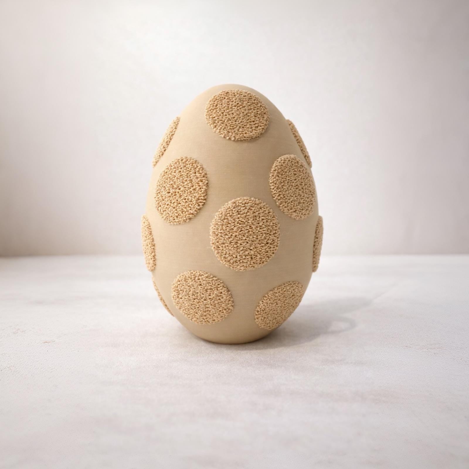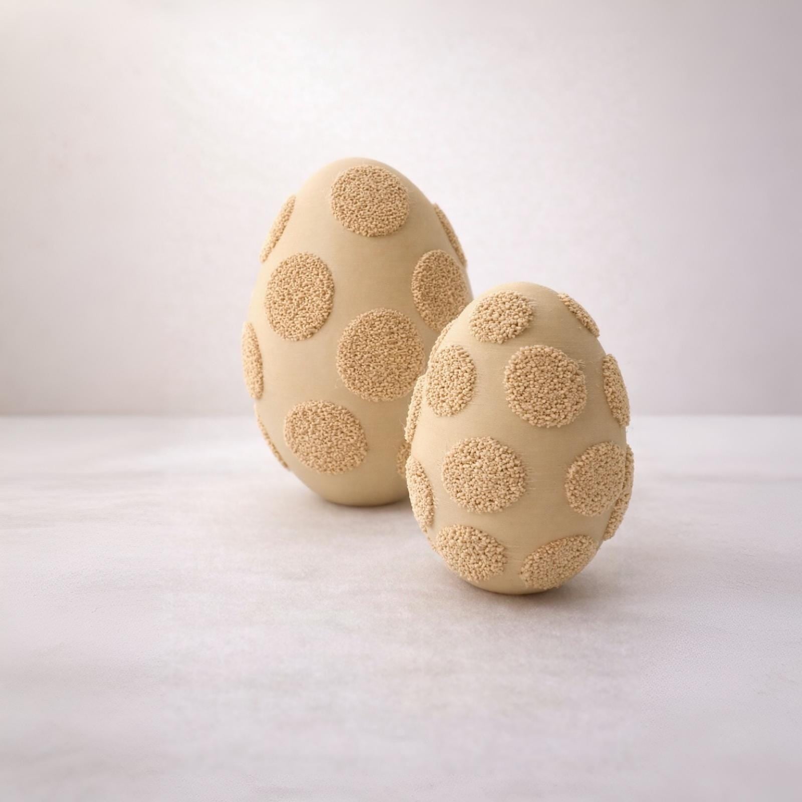 Diese dekorativen Ostereier überzeugen durch ihre besondere Oberfläche. Die runden, flauschig wirkenden Punkte sorgen für eine weiche, textile Optik – die Haptik ist jedoch fest, da die Eier im 3D-Druckverfahren gefertigt werden. Genau dieser Kontrast macht sie zu einem modernen Hingucker.