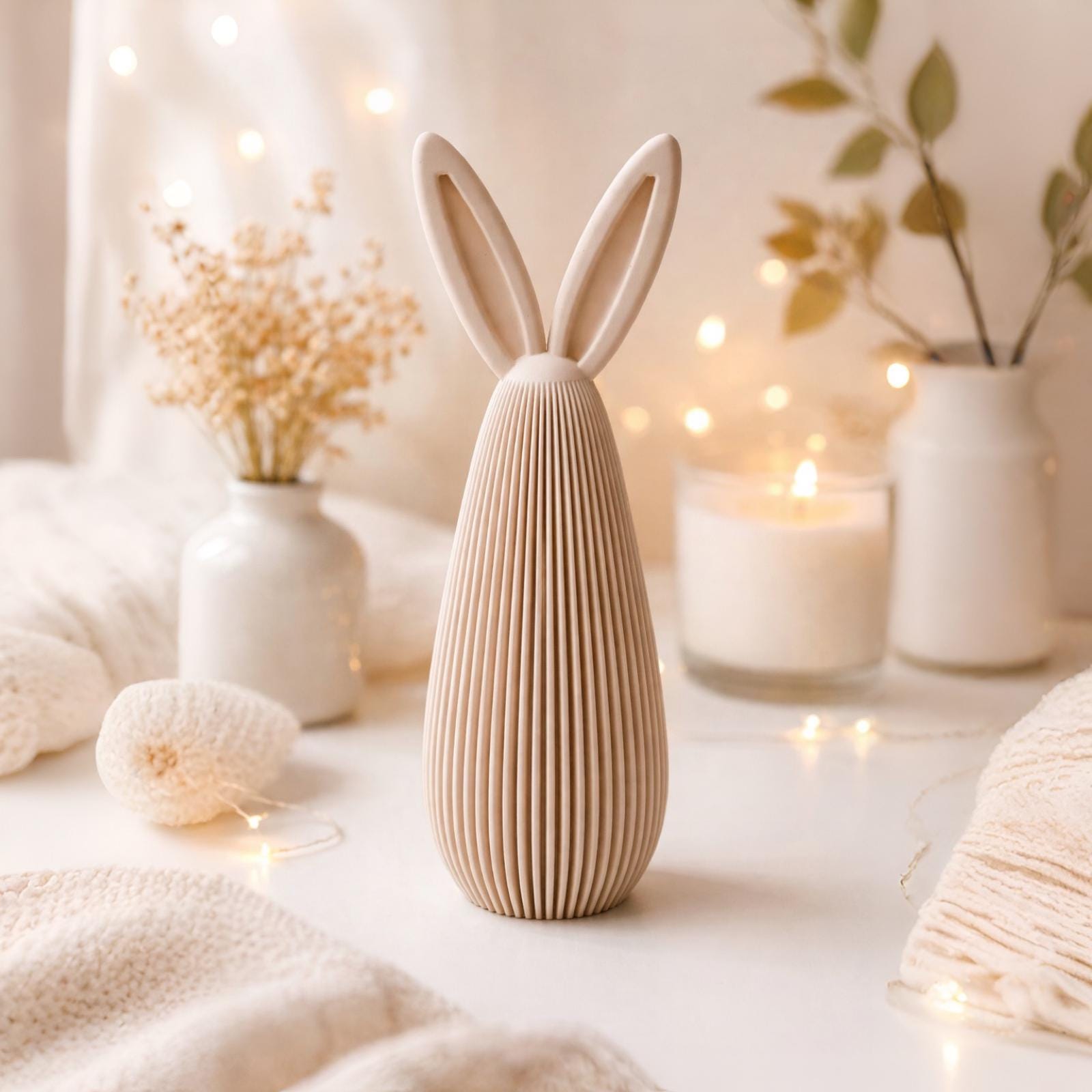 Ob auf dem Sideboard, dem Esstisch oder als dezente Osterdekoration – der Hase wirkt elegant, ruhig und hochwertig, ganz ohne verspielte Details. Die schlichte Form lässt ihm Raum, sowohl allein als Statement-Piece zu stehen als auch harmonisch mit anderen Deko-Elementen kombiniert zu werden.