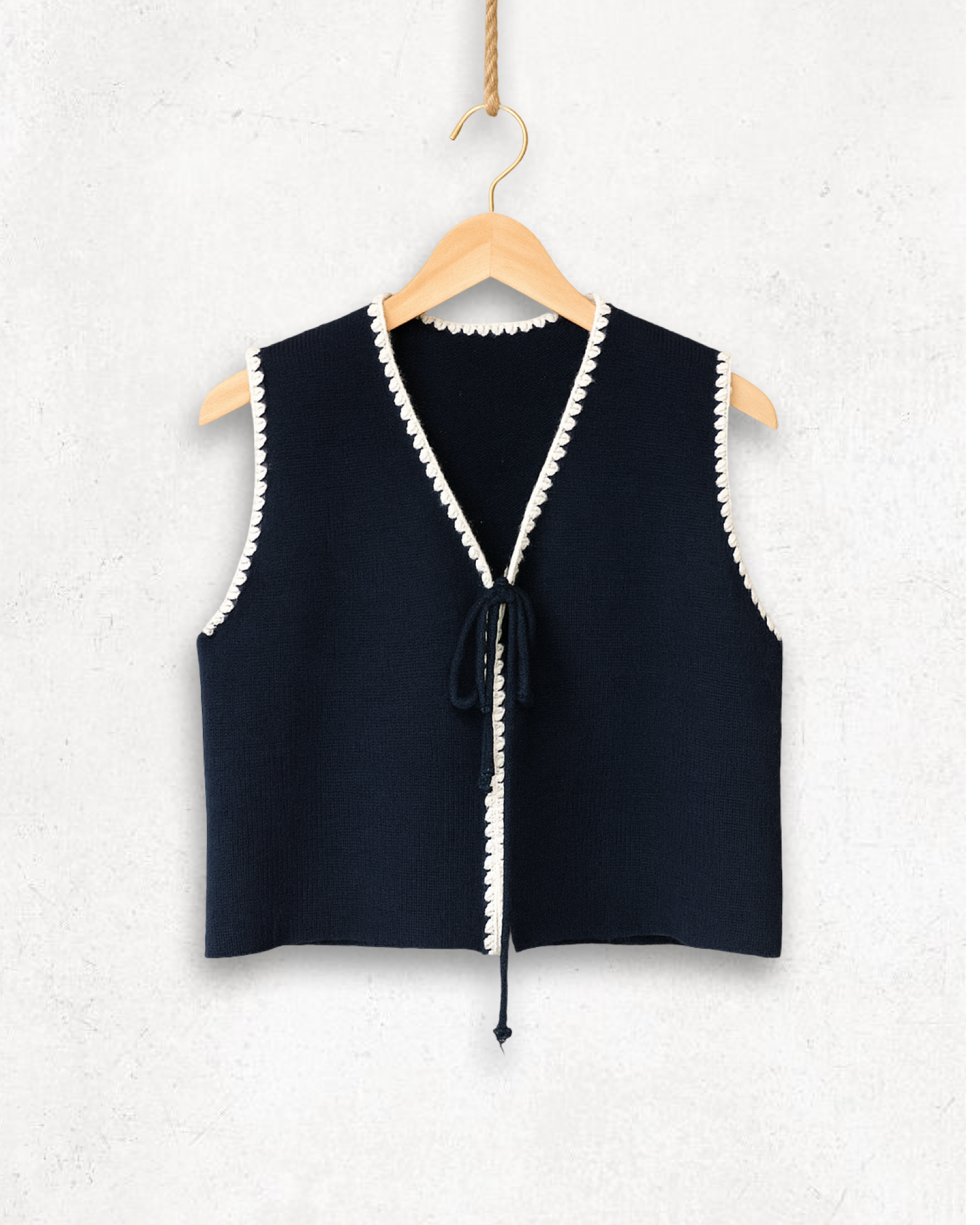 Dunkelblaue Strickweste mit Häkelkante und Schleifendetail