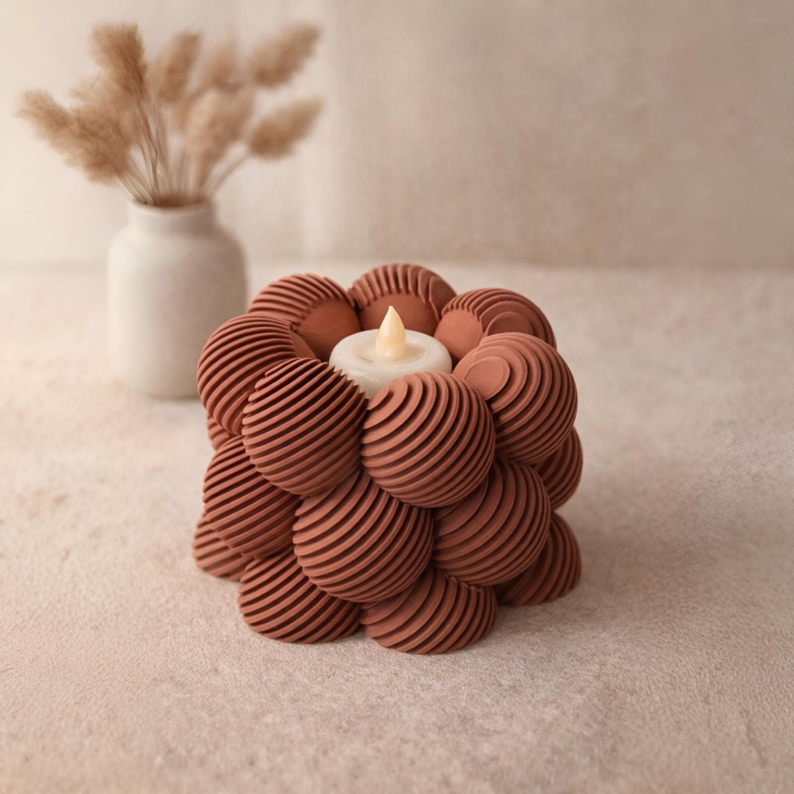Der Kerzenhalter wird im 3D-Druckverfahren hergestellt und hat eine matte Oberfläche. Mit einem LED-Teelicht entsteht ein sanftes Lichtspiel, das die Form schön zur Geltung bringt.