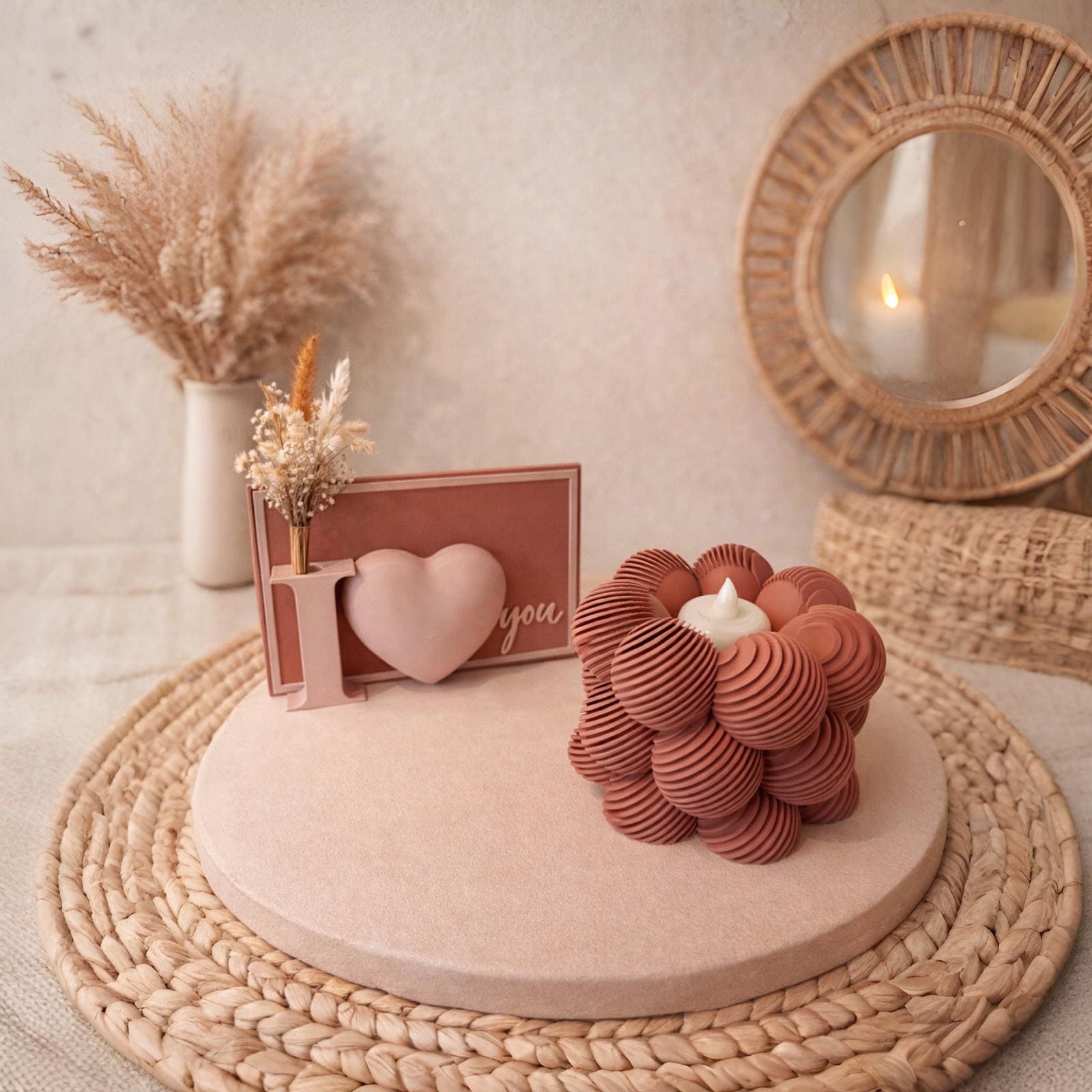 Durch die geschichtete, runde Struktur wirkt er wie eine abstrahierte Blume und setzt einen schönen Akzent auf Tisch, Regal oder Sideboard.