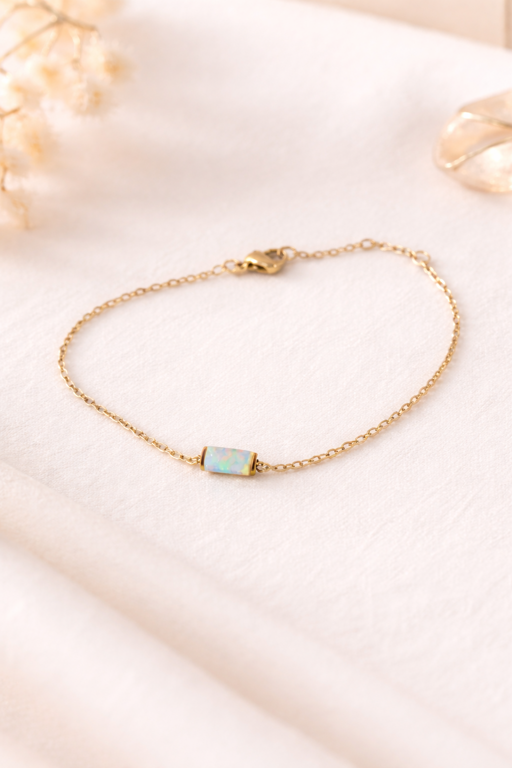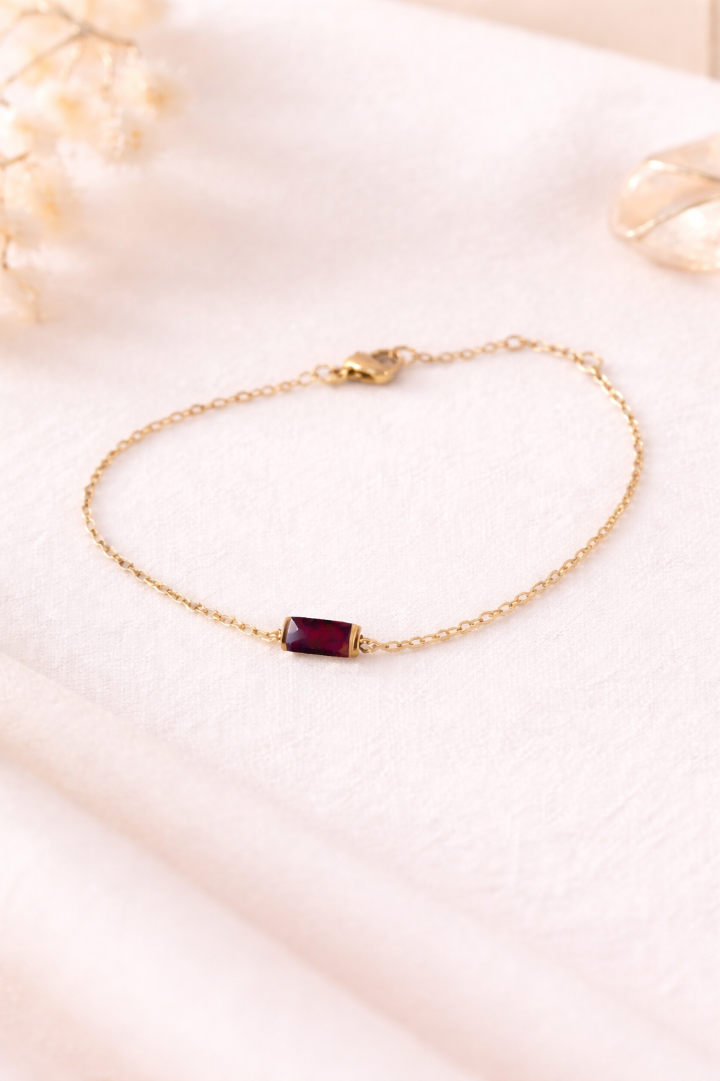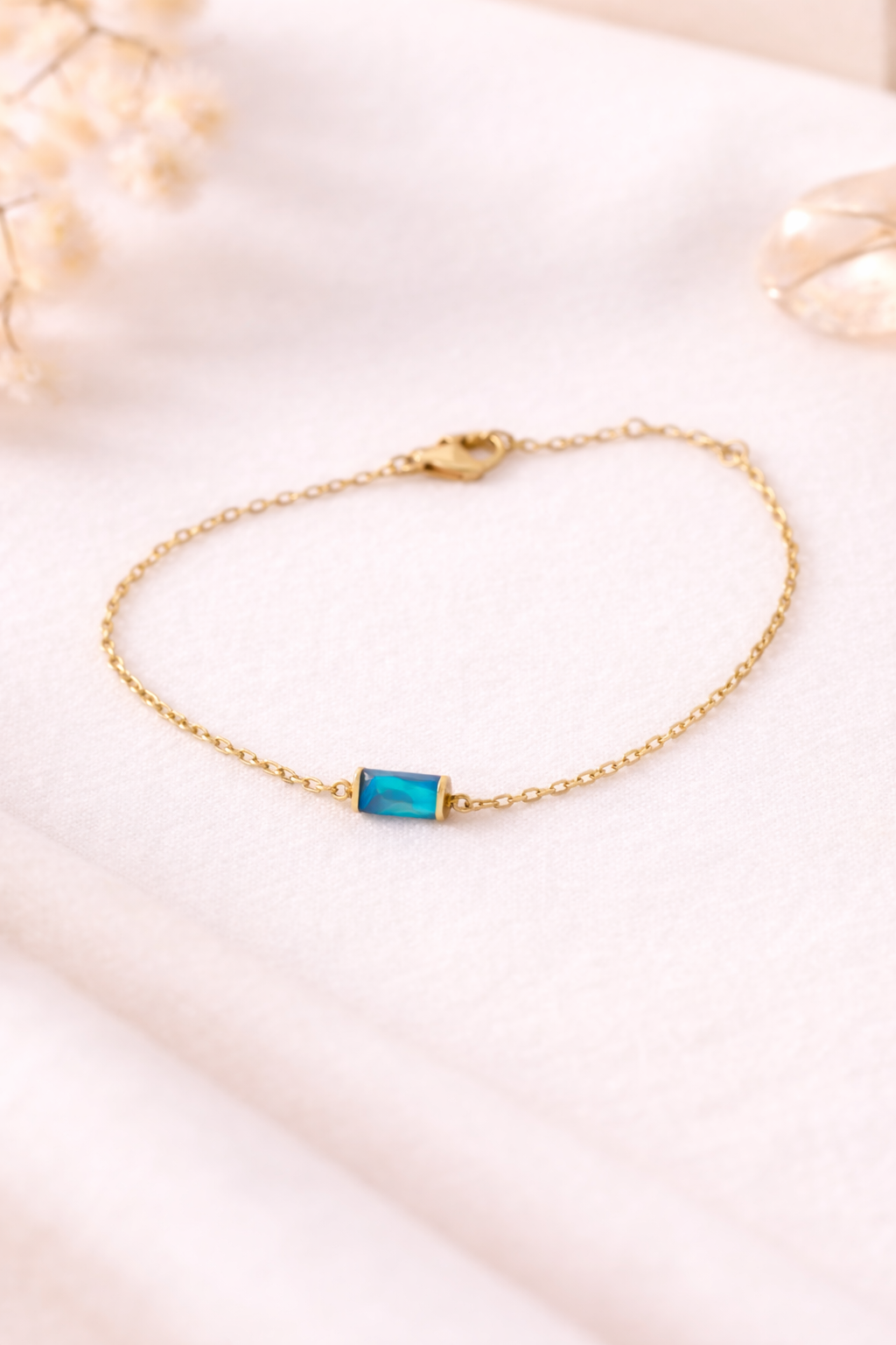 Die zarte Goldkette trifft auf einen kleinen, rechteckigen Stein, der dezent schimmert und dem Armband eine elegante, moderne Note verleiht.