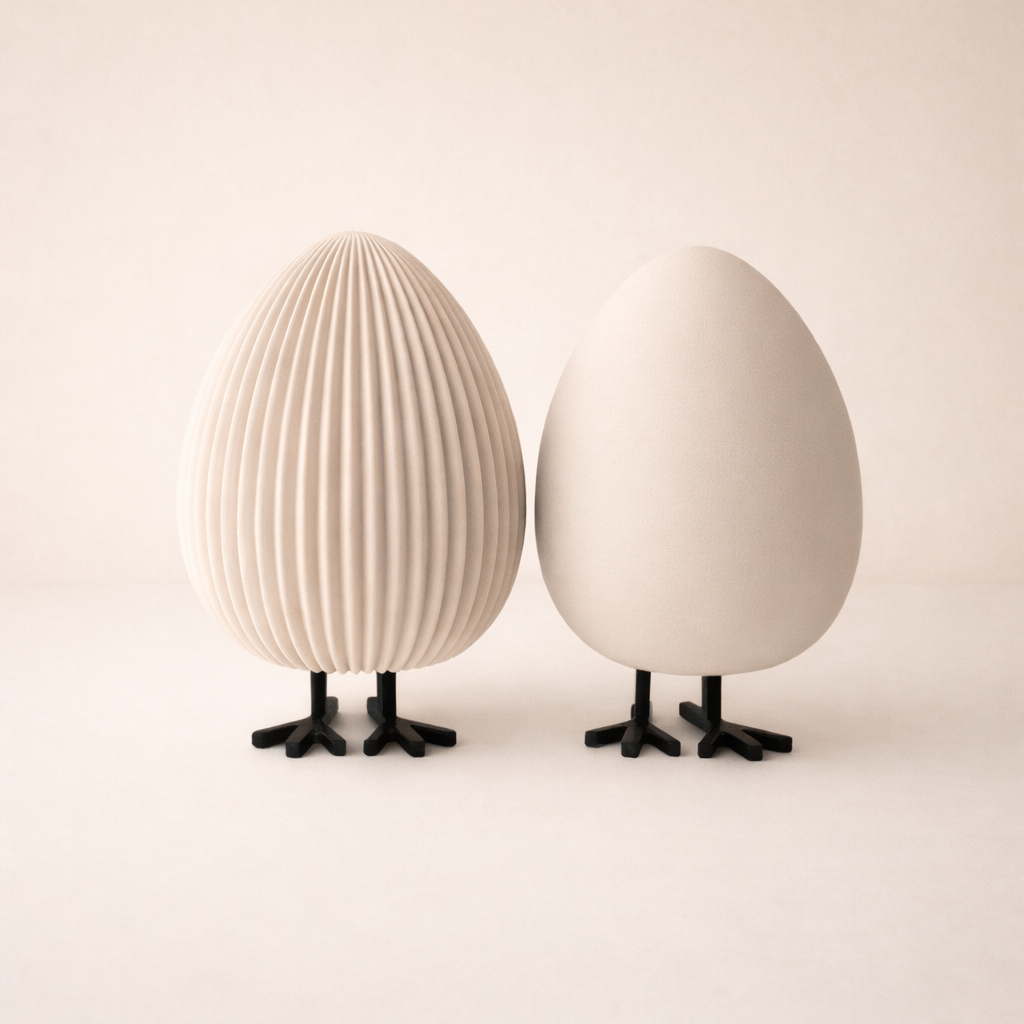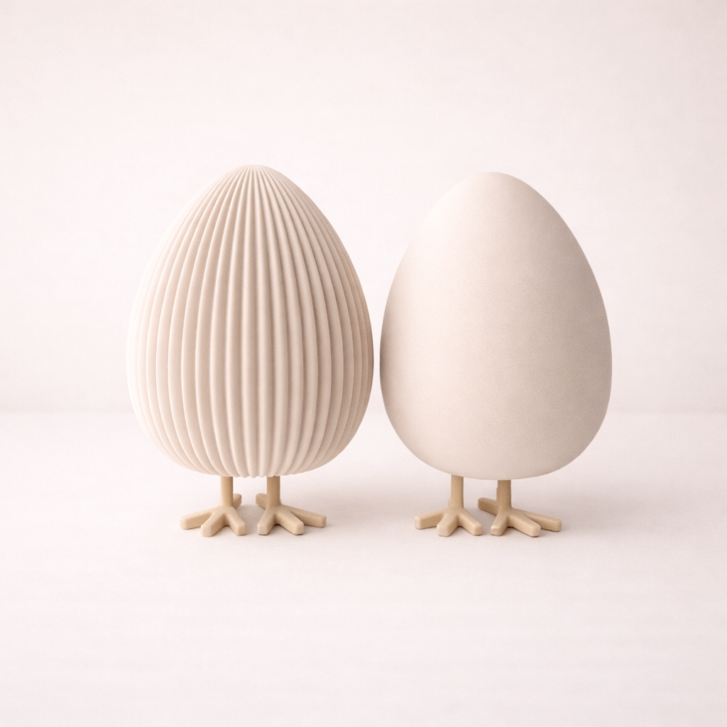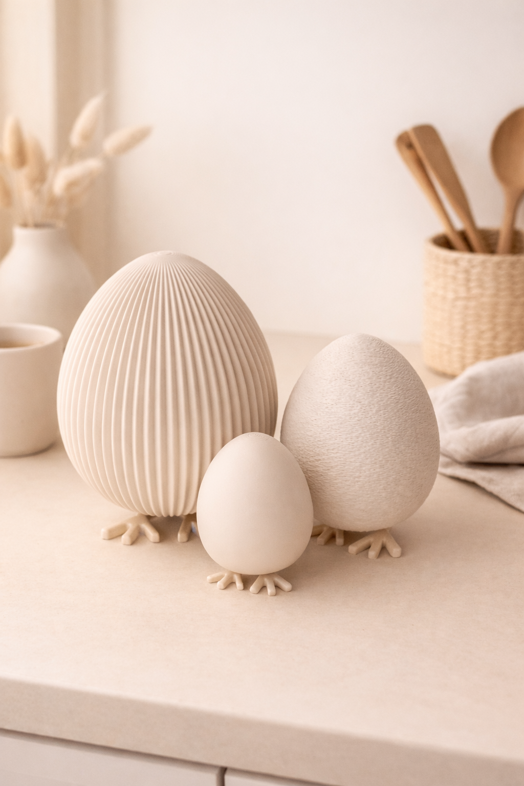 Gefertigt im hochwertigen 3D-Druck, wirken die Eier modern, leicht und zeitlos. Die kleinen Füße verleihen dem Design einen charmanten, fast verspielten Akzent und lassen das Ei sicher stehen – perfekt für Sideboards, Regale, Fensterbänke oder als dezente Osterdeko.