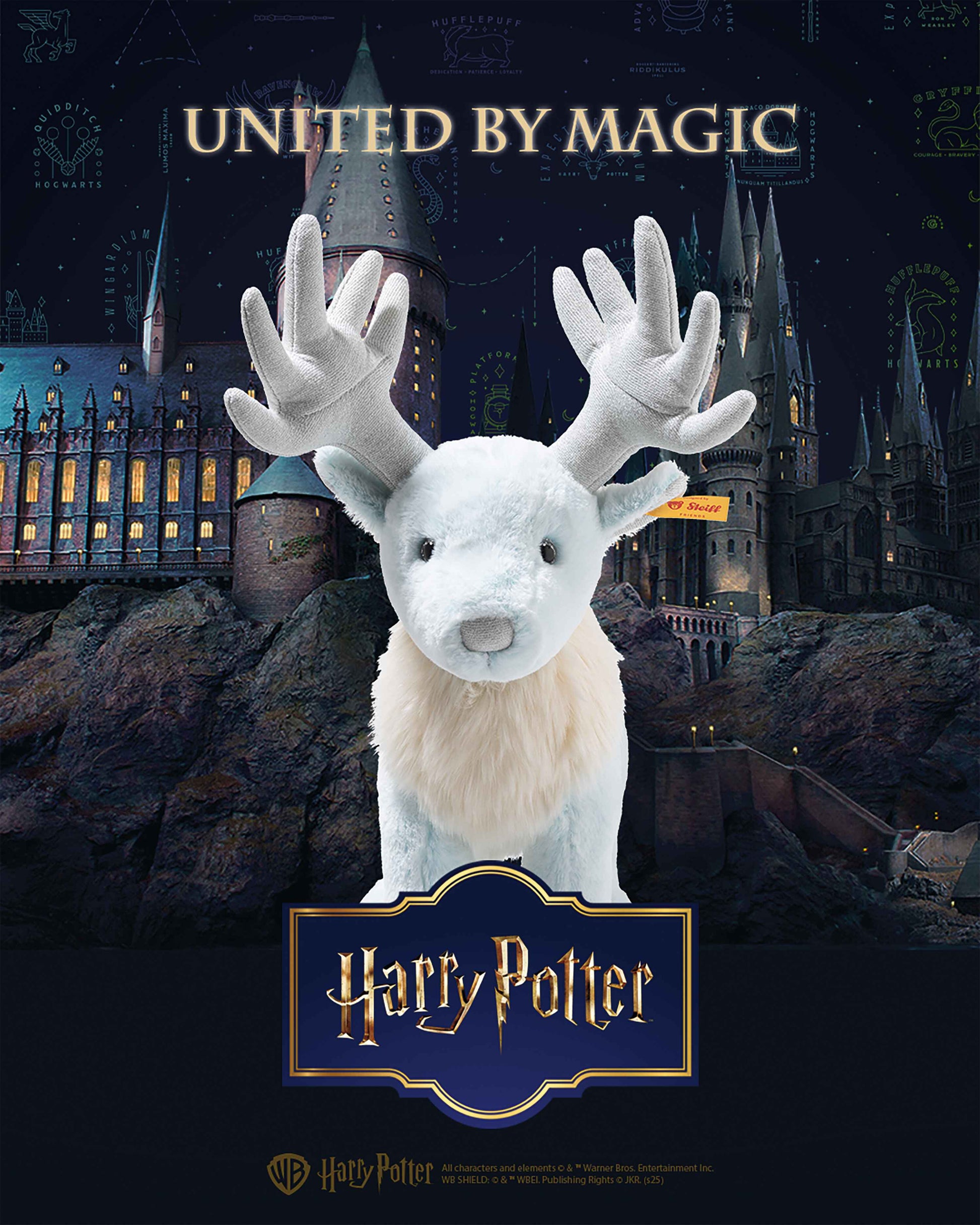 „Expecto Patronum!“ Harry Potters mächtiger Zauberspruch beschwört ein Schutzwesen, genannt „Patronus“. Dieses bewahrt ihn vor Gefahren und kommt für Harry in Gestalt eines Hirsches, der als Warner Brothers / Wizarding World Lizenzprodukt nun auch die Steiff Familie beschützt. Das 25 cm große zauberhafte Wesen strahlt mit seinem kuschelweichen Plüsch in zartem Blau und Weiß Geborgenheit und Schutz aus. Das mächtige Geweih funkelt silbern und die Augen blicken weise in die magische Welt. Durch die in die Füße eingearbeiteten Granulatgewichtssäckchen kann der Hirsch stabil stehen und uns vor dunklen Mächten bewahren.