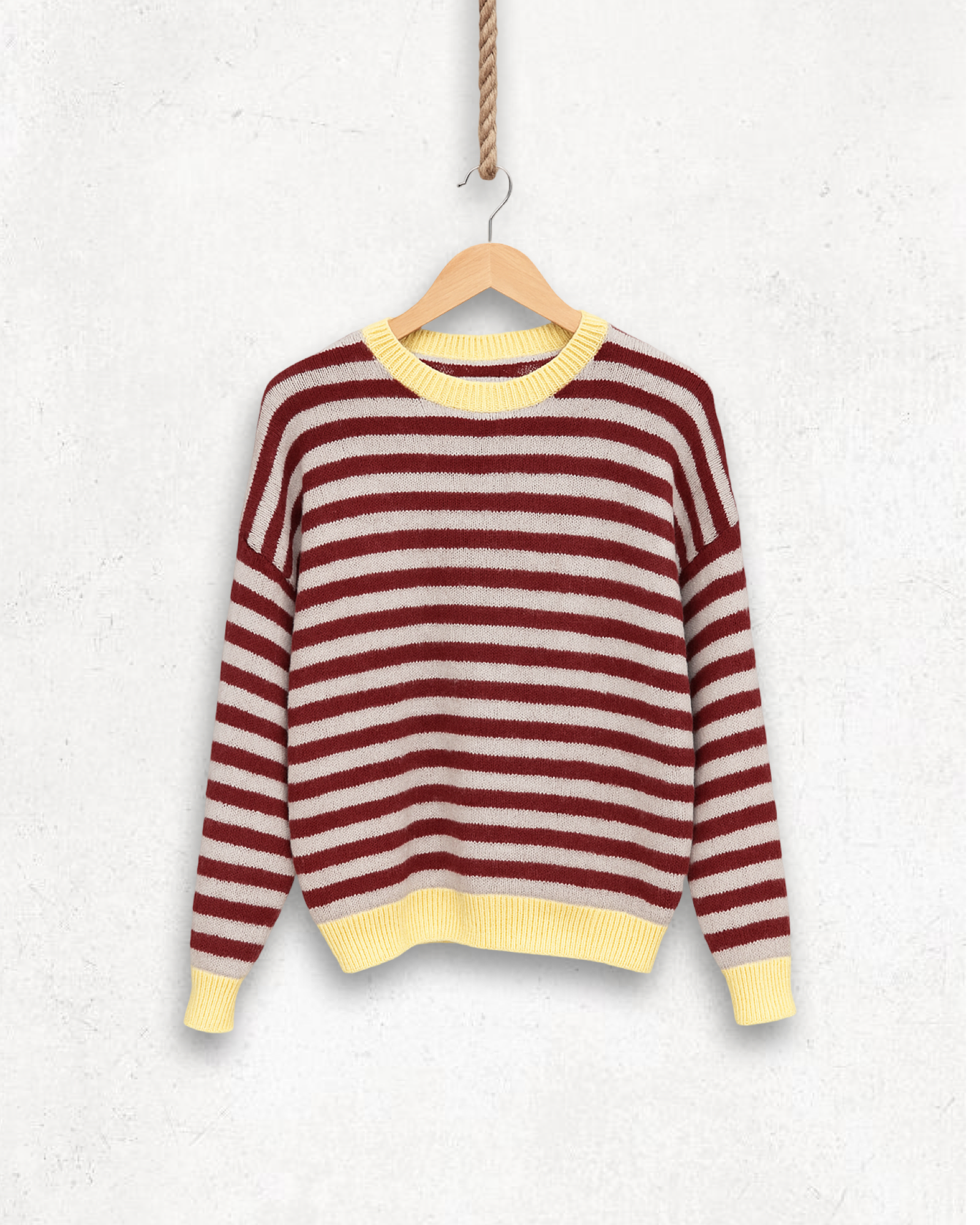 Langärmeliger Pullover mit Streifen in Grau und Burgunderrot mit gelbem Kragen, Bündchen und Saum